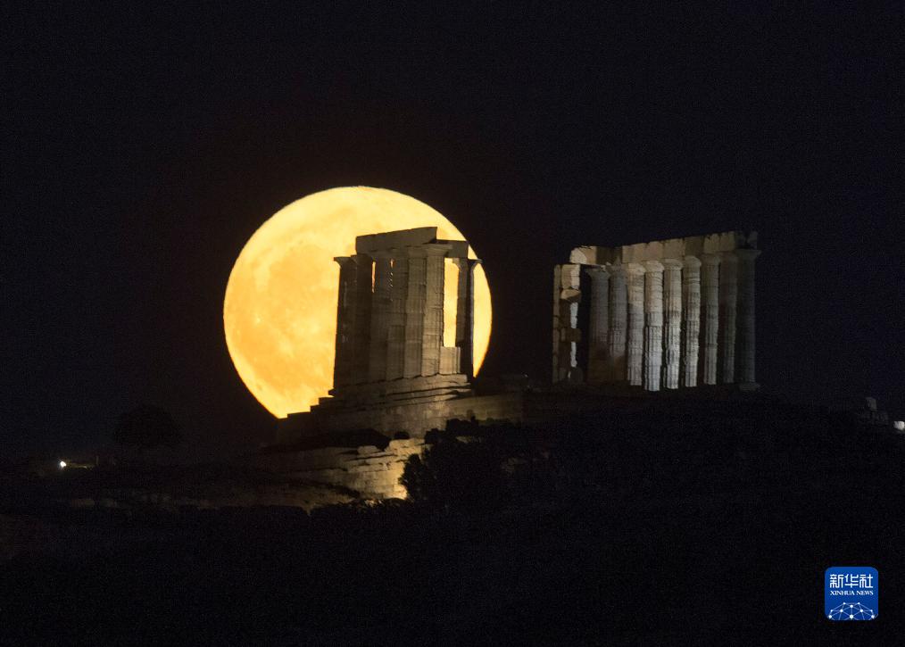 8月1日晚,一輪滿(mǎn)月在希臘雅典附近蘇尼翁角的波塞冬海神廟上空升起。
