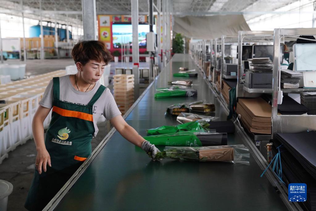 8月1日,在蘭州新區現代農業(yè)示范園花卉產(chǎn)業(yè)基地,工人在包裝玫瑰。