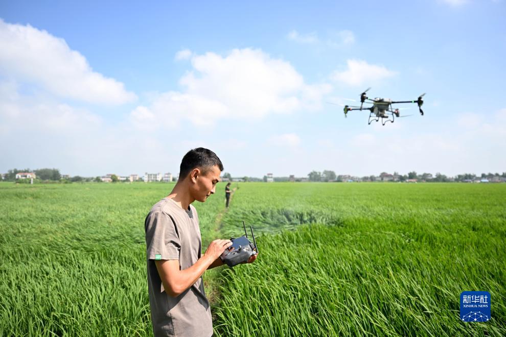 8月1日,在安徽省蚌埠市五河縣澮南鎮楊集村,吳家歡(前)使用無(wú)人機為水稻噴灑農藥。