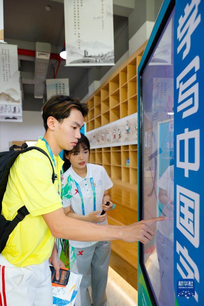 7月31日,在成都大運村的“漢語(yǔ)橋”中文學(xué)習互動(dòng)體驗區,菲律賓運動(dòng)員雷蒙德·巴勃羅 (左)通過(guò)數字互動(dòng)電子屏學(xué)寫(xiě)漢字。