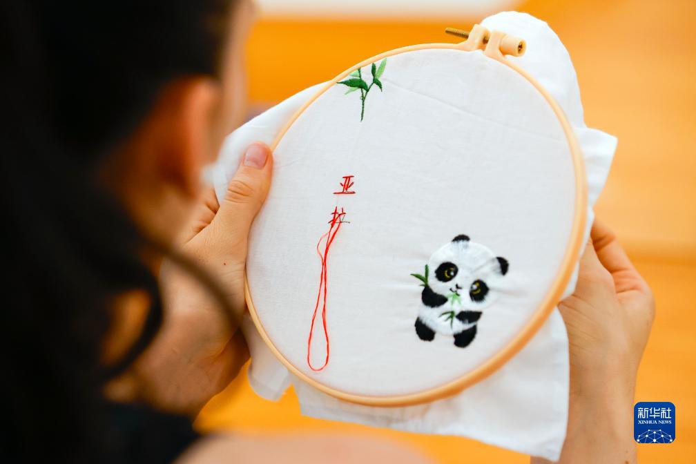 7月31日,在成都大運村,阿根廷運動(dòng)員亞拉·納瓦羅體驗在蜀繡作品上繡上自己的中文名字。