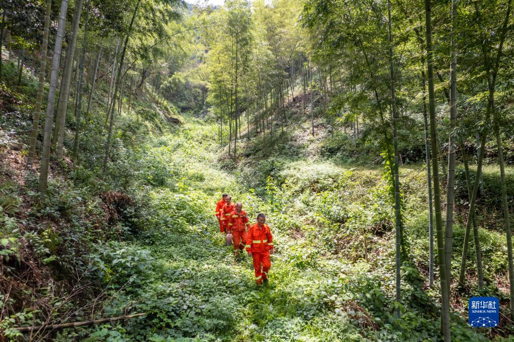 8月2日,在桃江縣桃花江國有林場(chǎng),護林員在竹林尋找竹蝗產(chǎn)卵地(無(wú)人機照片)。