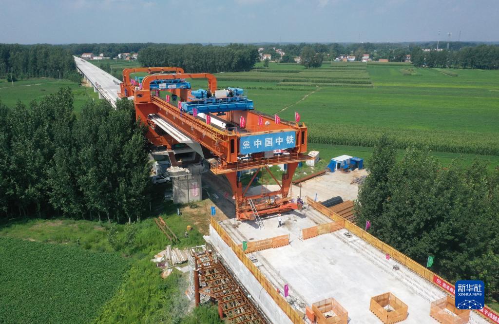 8月2日,架橋機在菏蘭高鐵蘭考特大橋上進(jìn)行箱梁架設作業(yè)(無(wú)人機照片)。