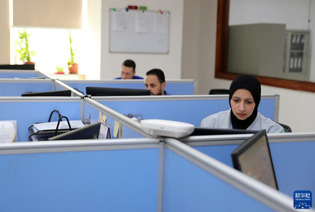 6月26日,在埃及蘇伊士,巨石埃及計調物流部副經(jīng)理迪娜(右)在辦公室工作。