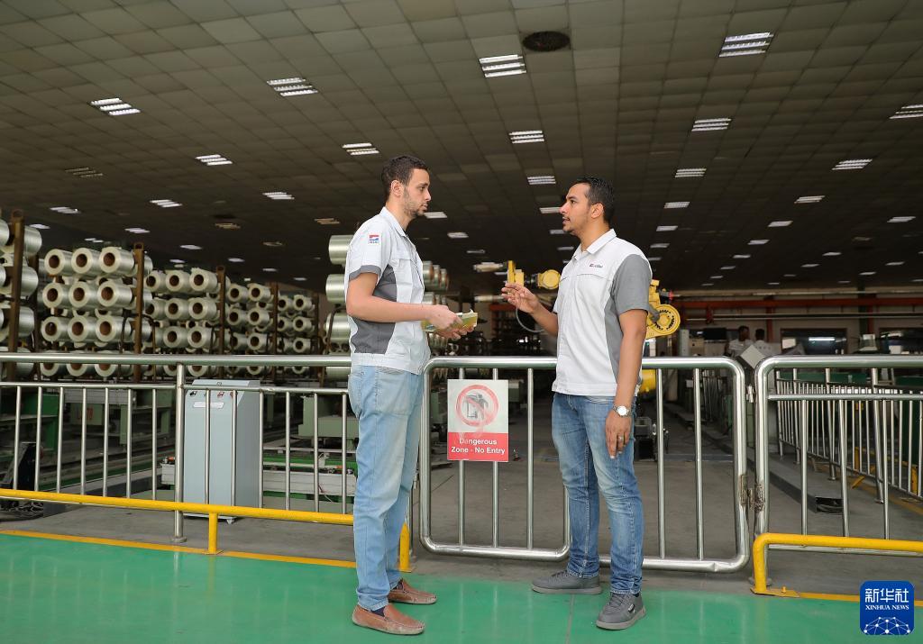 6月26日,在埃及蘇伊士,巨石埃及公司副總經(jīng)理蘇萊曼(右)在生產(chǎn)車(chē)間同員工交流。