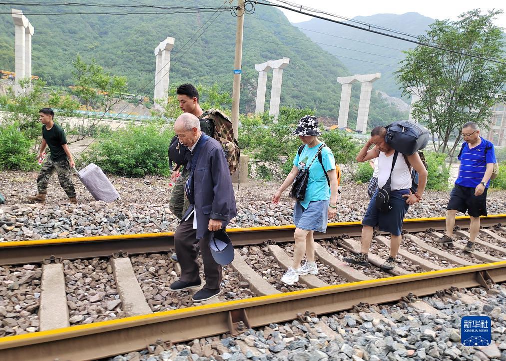 8月2日,Z180次受困列車(chē)的旅客徒步前往轉運客車(chē)(手機照片)。