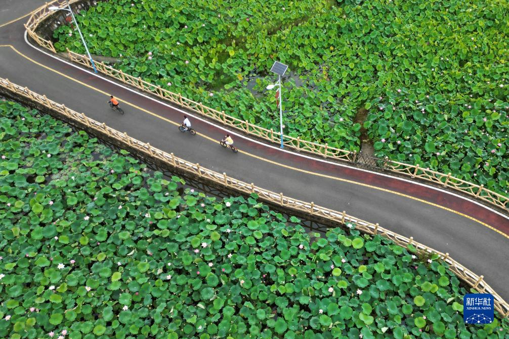 8月2日,在貴州省岑鞏縣客樓鎮下寨村,小朋友在荷塘間的道路上騎行(無(wú)人機照片)。