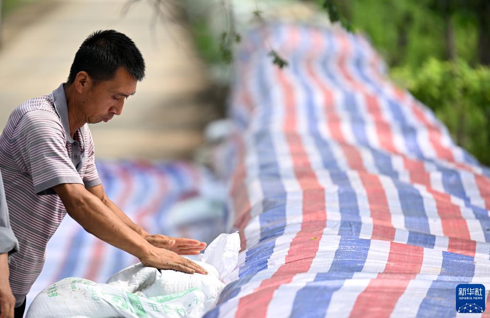 8月3日,抗洪人員在天津市西青區辛口鎮子牙河岸邊修筑子堤。