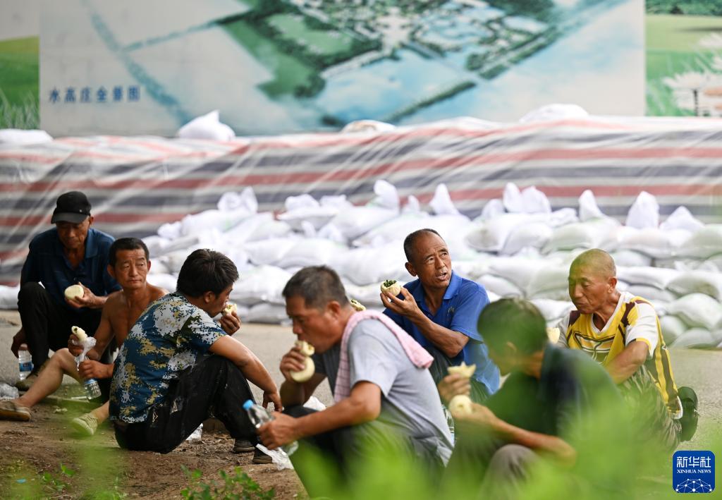 8月3日,抗洪人員在天津市西青區辛口鎮子牙河岸邊吃飯休息。