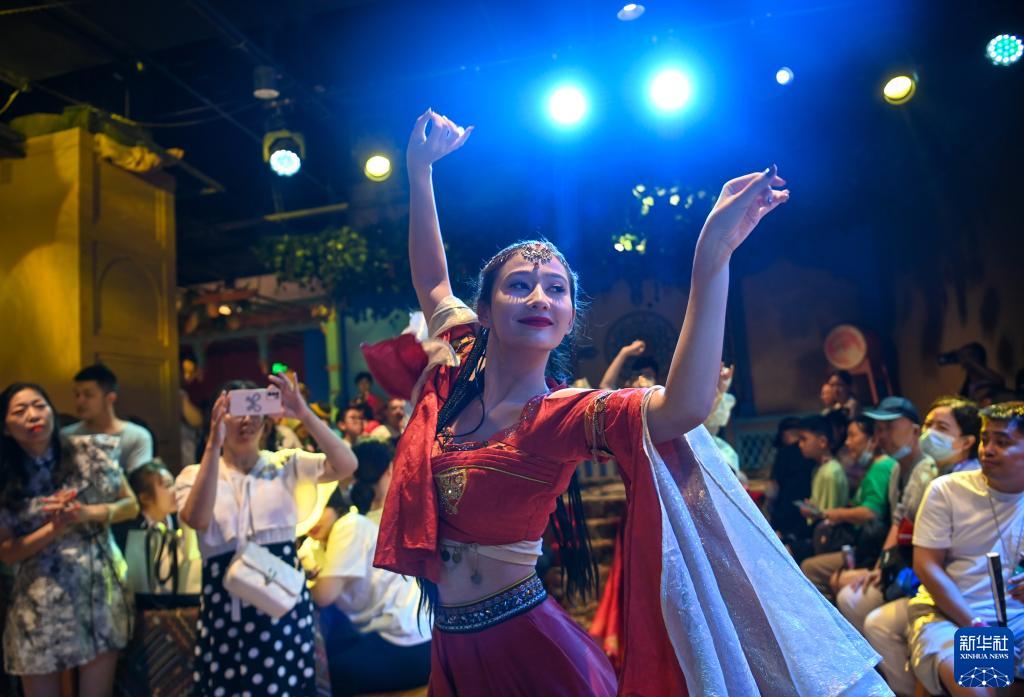 8月2日,游客在長(cháng)安十二時(shí)辰主題街區觀(guān)看唐風(fēng)演藝《胡姬酒肆》。