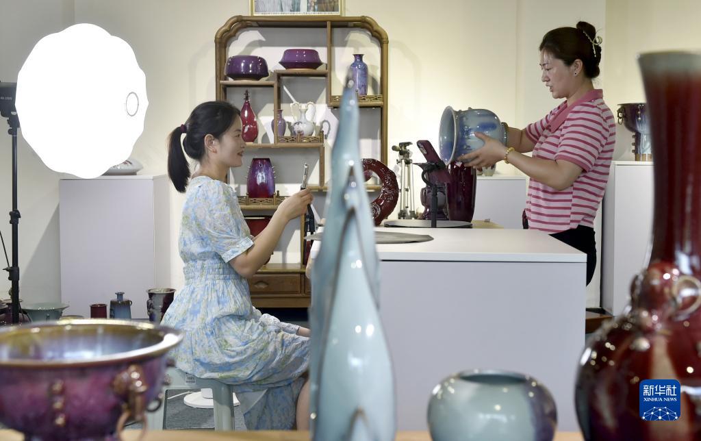 8月3日,河南省禹州市神垕鎮一家鈞瓷企業(yè)的工作人員通過(guò)手機直播銷(xiāo)售鈞瓷作品。
