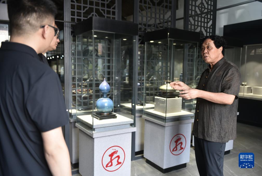 8月3日,中國工藝美術(shù)大師、國家級非遺項目“鈞瓷燒制技藝”代表性傳承人孔相卿(右)在孔家鈞窯的展廳里向來(lái)訪(fǎng)者介紹鈞瓷作品。