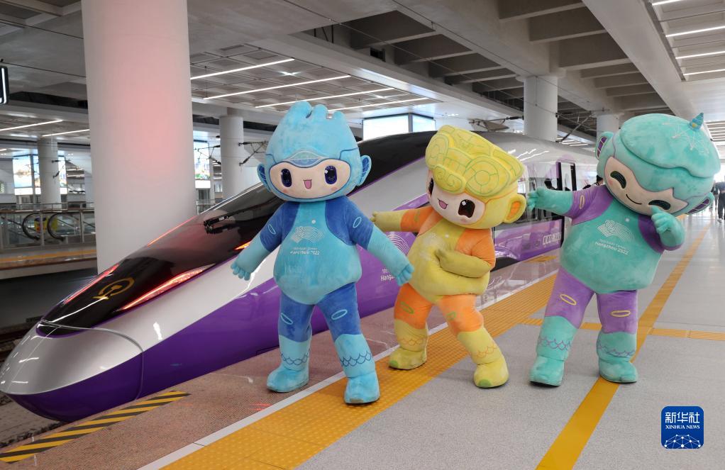 8月4日,在浙江省杭州西站,杭州亞運會(huì )吉祥物“琮琮”“蓮蓮”“宸宸”與復興號亞運智能動(dòng)車(chē)組列車(chē)合影留念。