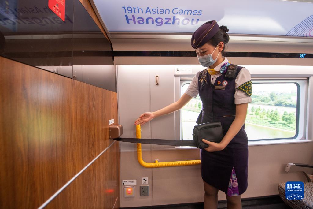 8月4日,鐵路杭州客運段乘務(wù)員展示復興號亞運智能動(dòng)車(chē)組車(chē)廂內的無(wú)障礙設施——輪椅固定處。