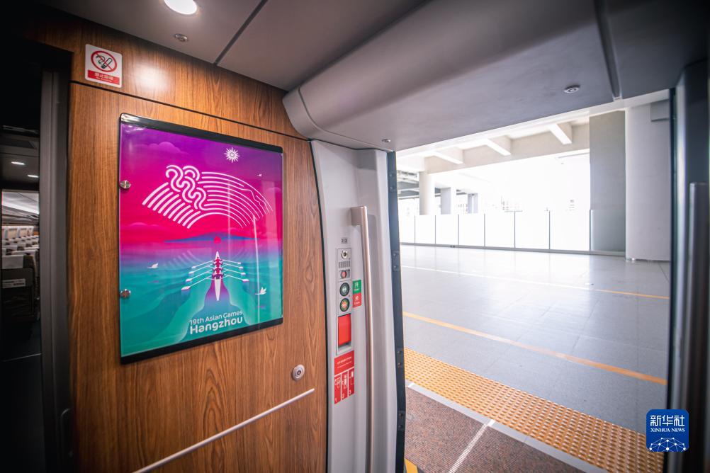 復興號亞運智能動(dòng)車(chē)組車(chē)廂門(mén)口掛有杭州亞運會(huì )海報裝飾(8月4日攝)。