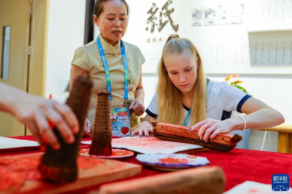 8月3日,在成都大運村的互動(dòng)體驗中心,芬蘭運動(dòng)員杰茜卡·卡哈拉在非遺項目夾江年畫(huà)代表性傳承人陳曉容(左)的指導下制作年畫(huà)。