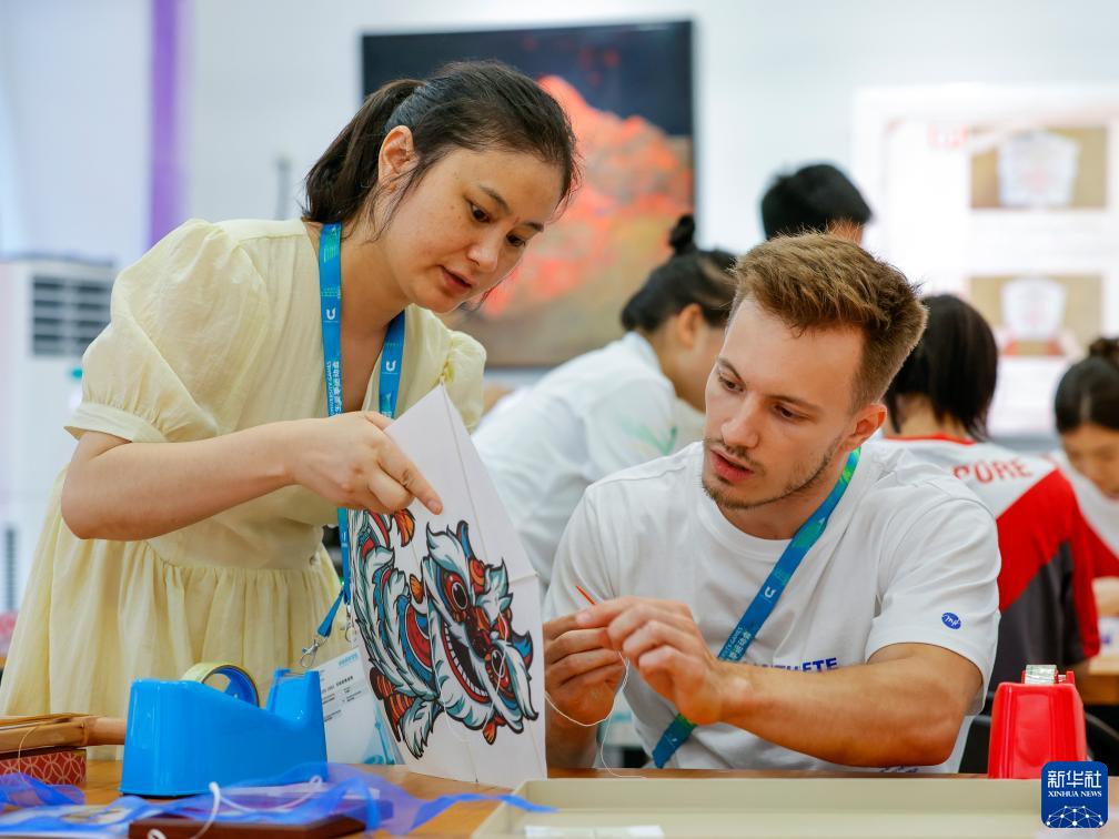 8月3日,在成都大運村的互動(dòng)體驗中心,非遺項目彭州敖平風(fēng)箏代表性傳承人陳鳳(前左)指導阿塞拜疆運動(dòng)員尼基塔·西蒙諾夫制作風(fēng)箏。