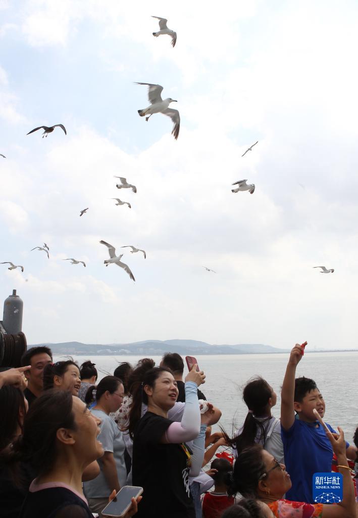 8月3日,游客在乘船前往蓬萊長(cháng)島時(shí)觀(guān)賞海鷗。