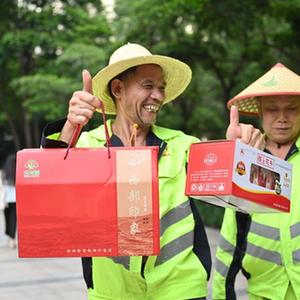 當日,在福州市鼓樓區,一些環(huán)衛工人領(lǐng)到由工會(huì )發(fā)放的西瓜、愛(ài)心涼茶、清涼大禮包等高溫防暑慰問(wèn)品。