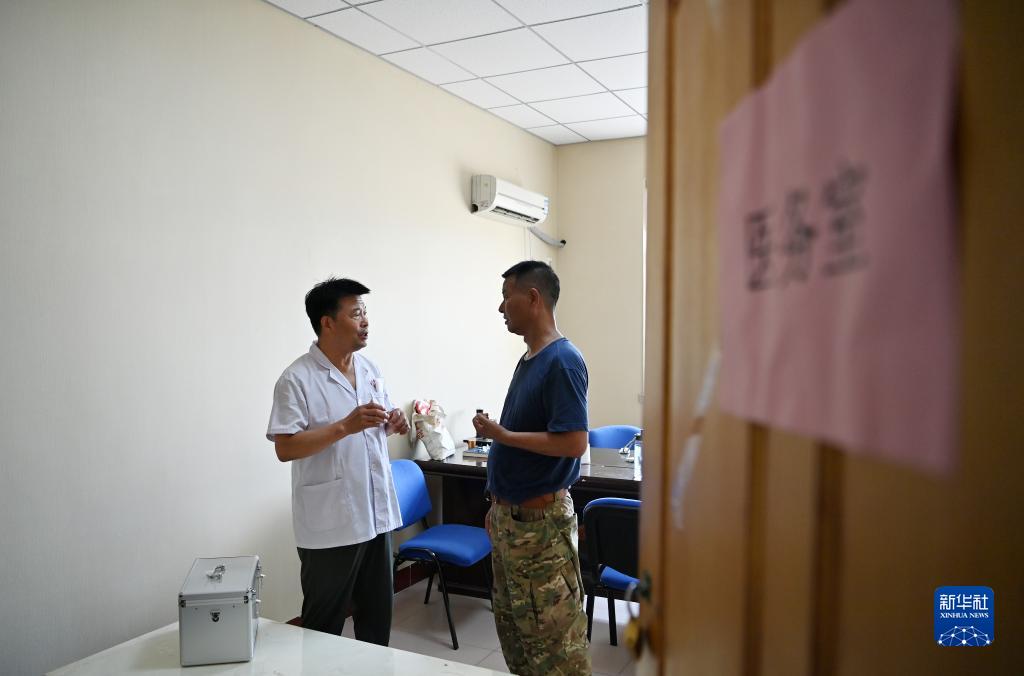 8月4日,郝慶水(右)在第六埠村安置點(diǎn)內的醫務(wù)室和醫生交流。