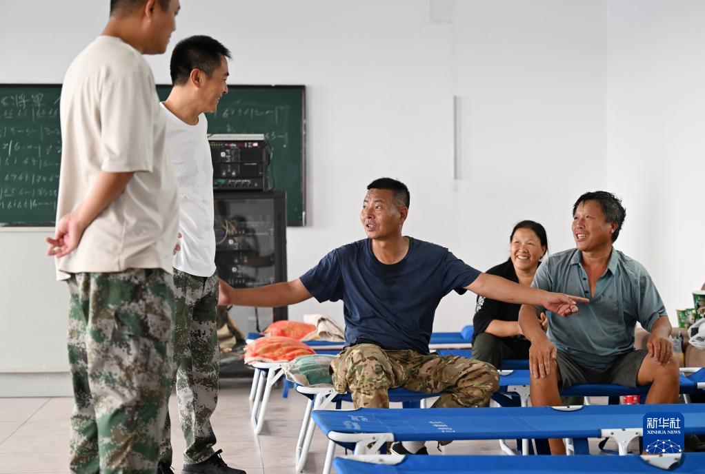 8月4日,郝慶水(左三)和村干部一起在第六埠村安置點(diǎn)和群眾交流。