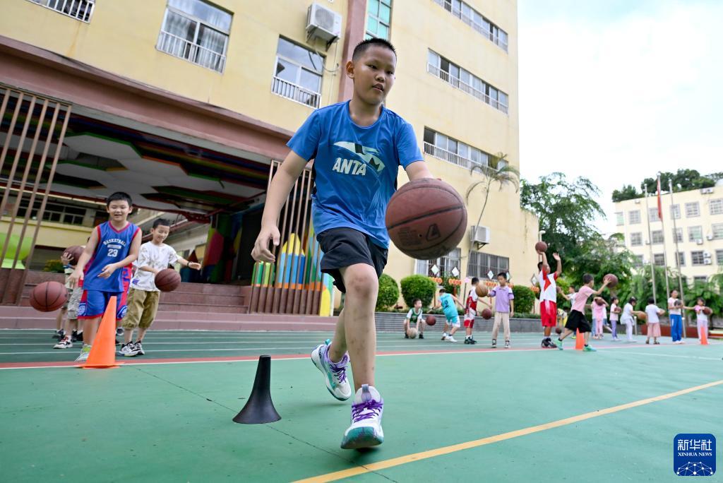 8月4日,參加暑期托管的學(xué)生在??谑杏⒉判W(xué)上籃球課。