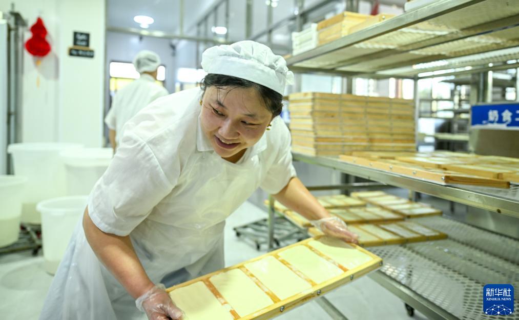 8月3日,在扎魯特旗百順養殖專(zhuān)業(yè)合作社,一名工作人員制作奶豆腐。