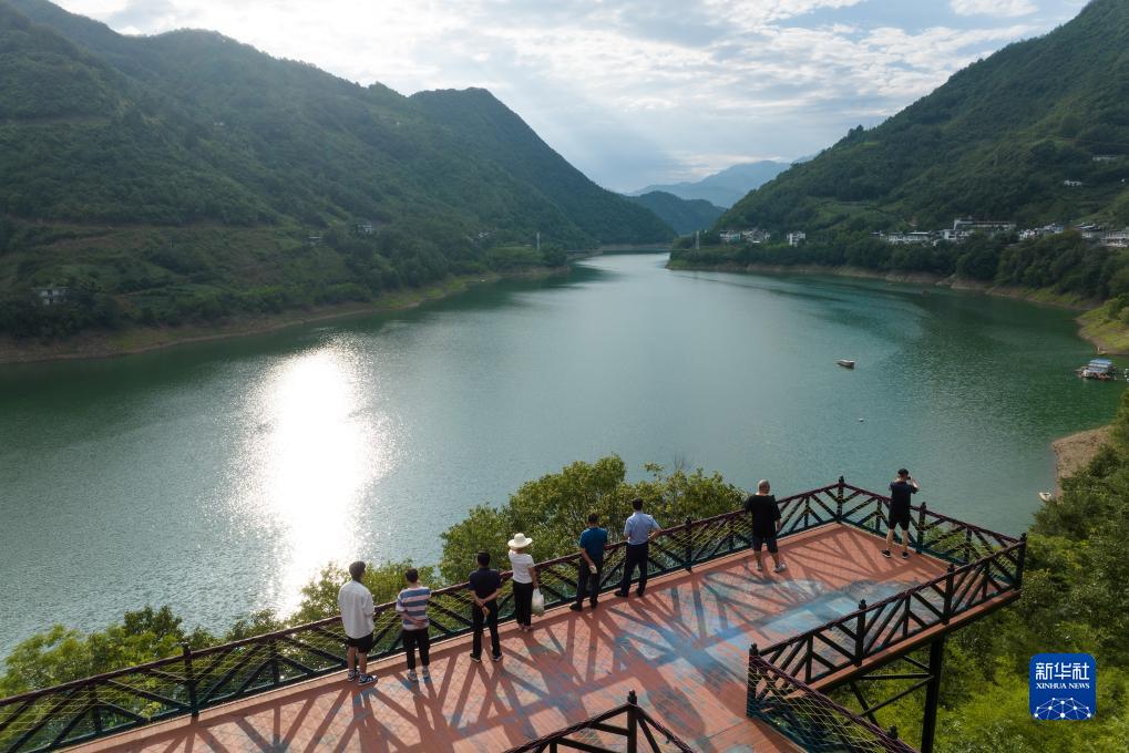 8月3日,游客在嵐皋縣南宮山鎮嵐河邊的觀(guān)景平臺上游覽(無(wú)人機照片)。