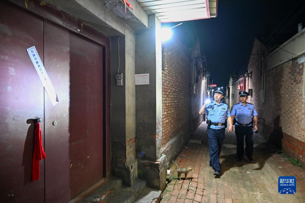 8月4日,天津市公安局靜海分局臺頭派出所執勤民警夜間在轄區村莊內巡邏,防范轉移居民財產(chǎn)丟失。