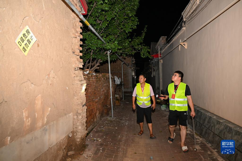 8月4日,在天津市靜海區臺頭鎮南二堡村,村黨支部書(shū)記、村委會(huì )主任韓建祥(右)帶領(lǐng)干部檢查村內危房。