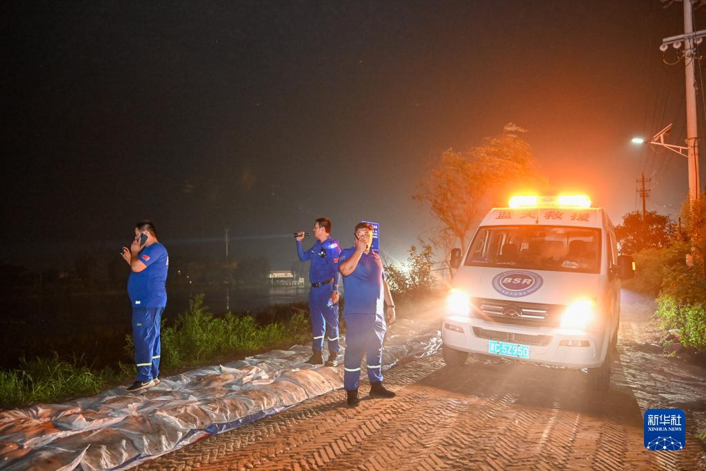 8月4日,在大清河天津靜海段北堤,天津靜海藍天救援隊隊員夜間巡堤時(shí)發(fā)現隱患點(diǎn)后,通過(guò)燈光指引與對講機呼話(huà)和南堤隊員協(xié)同處理。