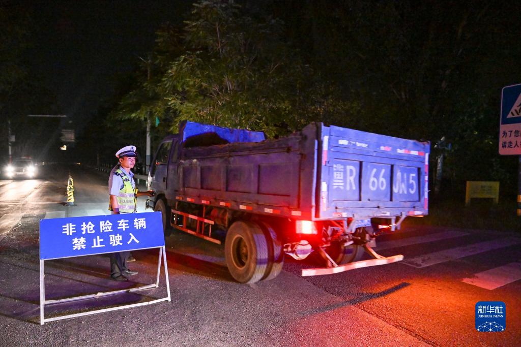 8月4日,天津市公安局靜海分局執勤交警在臺頭鎮入鎮卡口處指揮搶險車(chē)輛進(jìn)入。