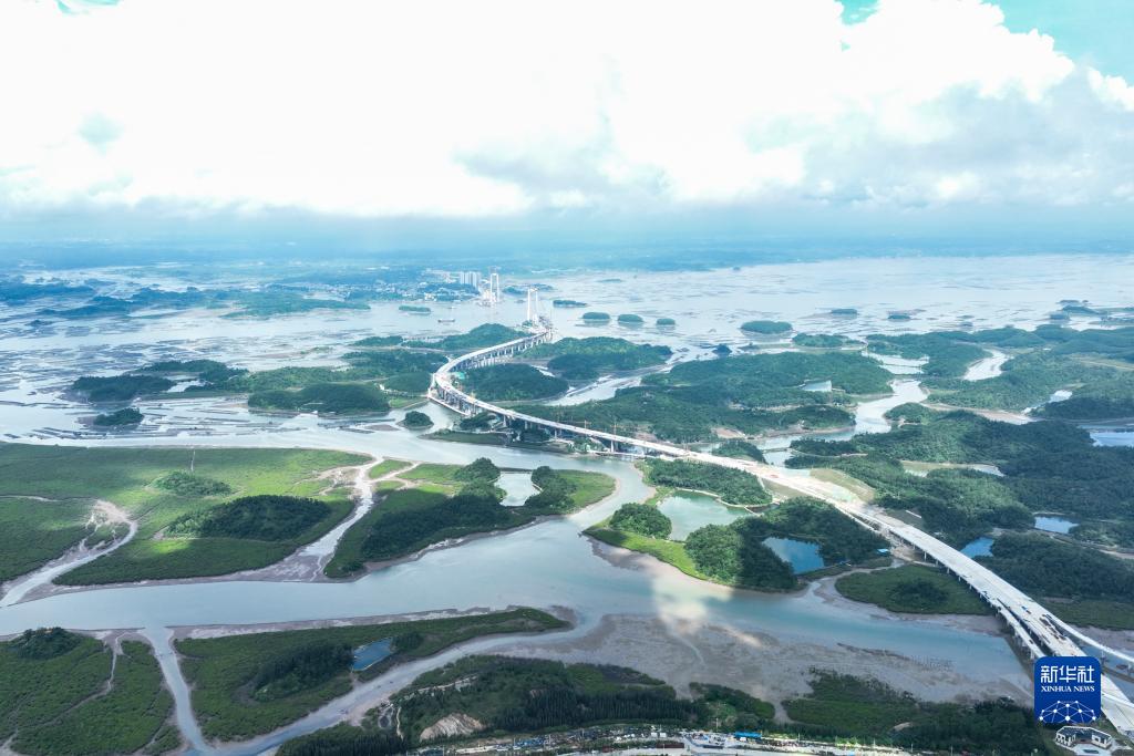 這是7月22日拍攝的建設中的廣西最長(cháng)跨海大橋——龍門(mén)大橋(無(wú)人機照片)。