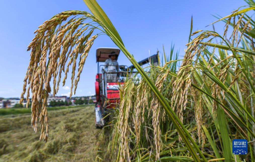 8月5日,在湖南省常寧市板橋鎮西洞村,村民駕駛收割機收割中稻。
