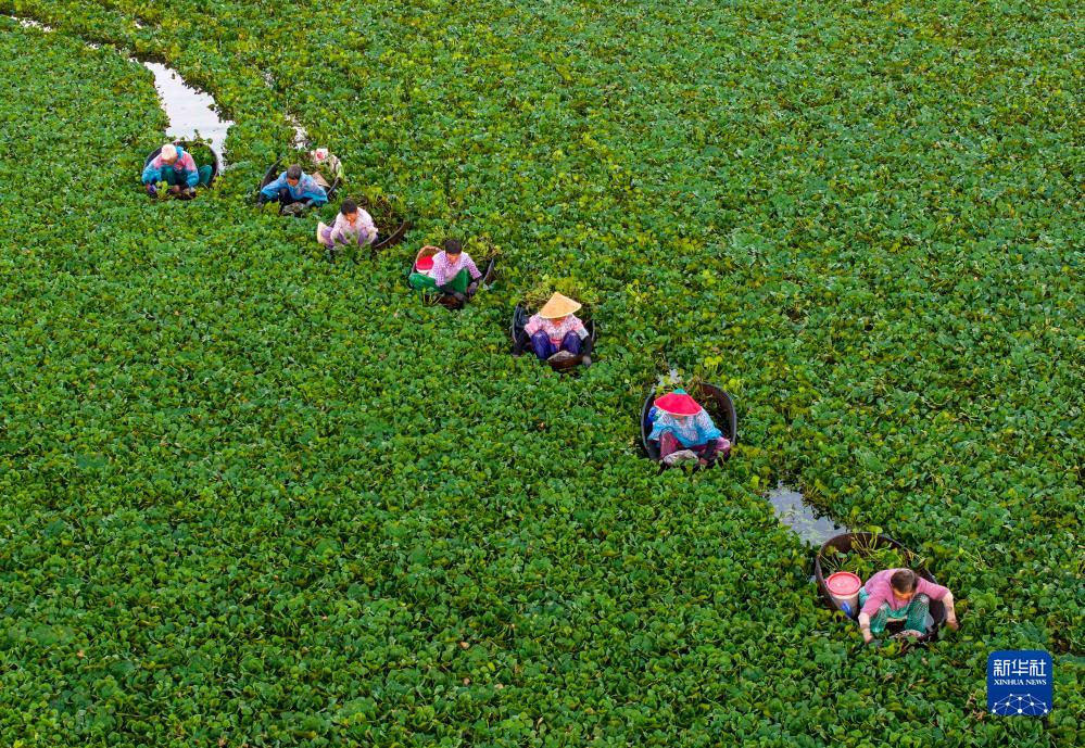 8月5日,江蘇省泰州市姜堰區溱潼鎮溱東村村民劃著(zhù)菱桶采摘菱角(無(wú)人機照片)。