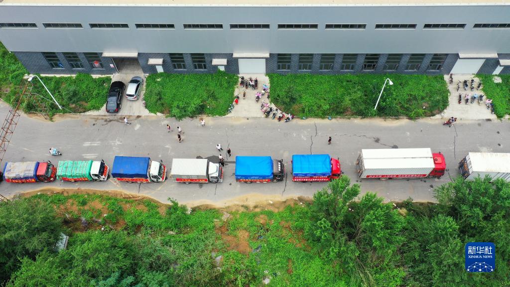 8月5日,在河北省涿州市鋼研物資儲備點(diǎn)外,運送物資的車(chē)輛排起了長(cháng)隊(無(wú)人機照片)。