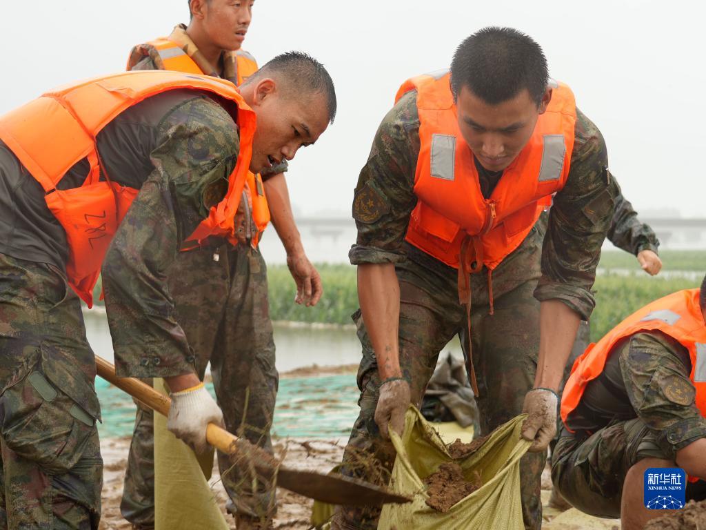 陸軍第82集團軍“鐵軍旅”組織官兵在河北省高碑店市白溝河沿岸對堤壩進(jìn)行加固(8月1日攝)。新華社發(fā)(楊仕偉 攝)