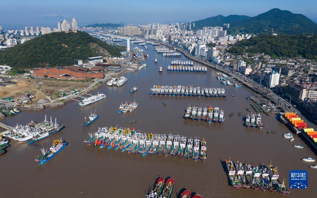 8月6日,停泊在舟山普陀沈家門(mén)漁港的漁船即將出港(無(wú)人機照片)。