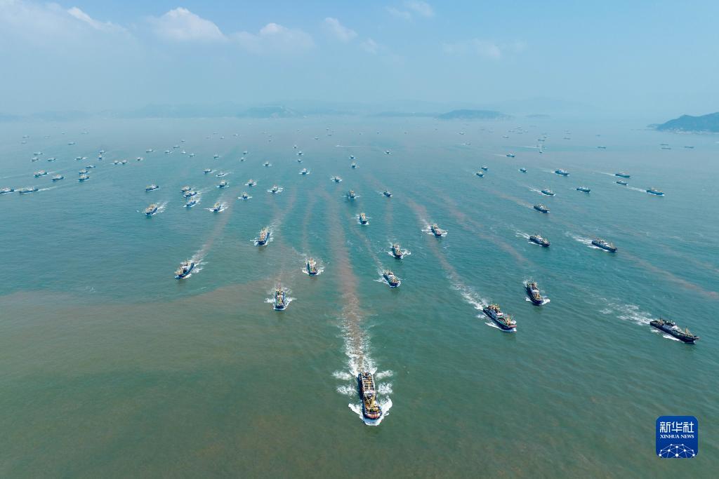 8月6日,浙江省溫嶺市漁船揚帆駛向東海(無(wú)人機照片)。