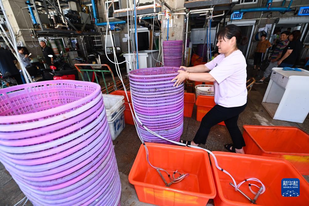 8月6日,舟山國際水產(chǎn)城海鮮活品經(jīng)營(yíng)戶(hù)在為迎接開(kāi)漁后首批漁獲做準備工作。