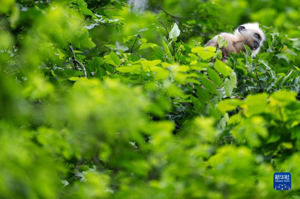 一只白頭葉猴在樹(shù)林中覓食(8月5日攝)。
