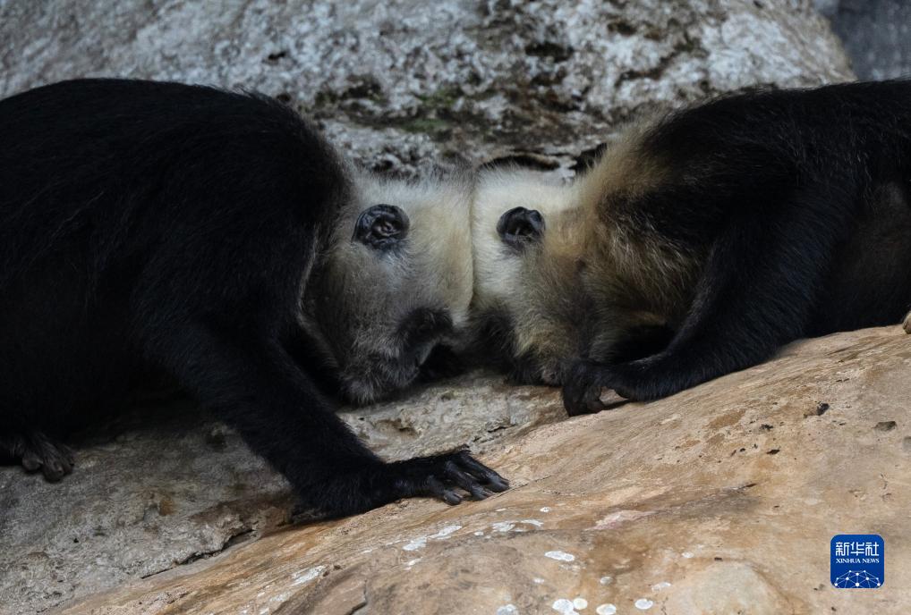 兩只白頭葉猴在玩頂頭的游戲(8月5日攝)。