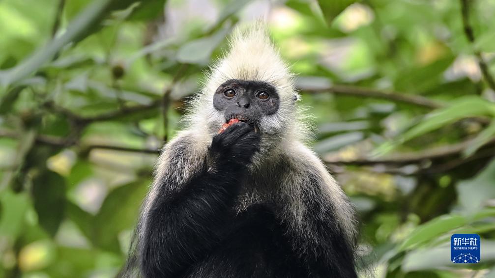 一只白頭葉猴在食用鮮果(8月4日攝)。