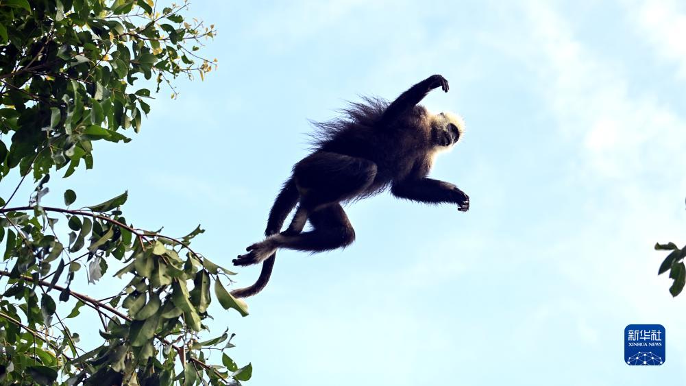 一只白頭葉猴在林間跳躍(8月5日攝)。