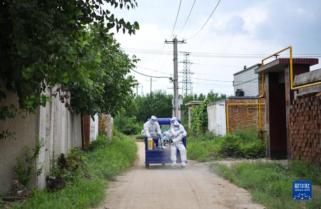 8月6日,在河北省涿州市刁窩鎮白塔村,防疫人員在進(jìn)行道路消殺作業(yè)。