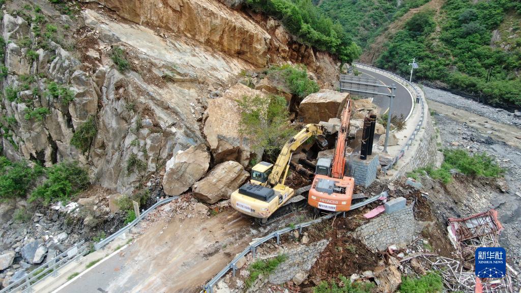 8月6日,在北京市房山區史家營(yíng)鄉金雞臺村附近,北京建工機施集團的大型機械設備在清理阻斷道路的落石(無(wú)人機照片)。