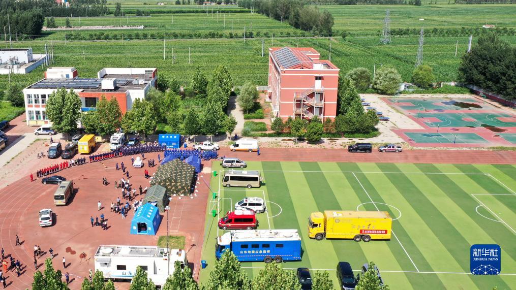 8月6日,在平原縣王打卦中心小學(xué),應急救援隊伍集結待命(無(wú)人機照片)。