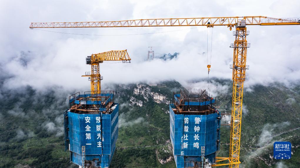 正在修建中的花江峽谷大橋5號主塔(8月3日攝,無(wú)人機照片)。