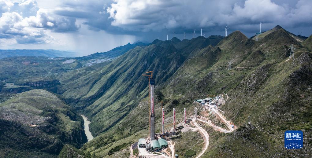 正在修建中的花江峽谷大橋5號主塔(8月2日攝,無(wú)人機照片)。