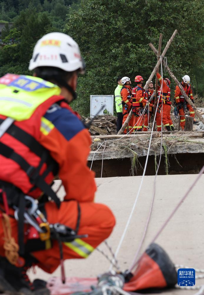 8月6日,吉林市消防救援支隊隊員在斷橋上搭設繩橋。